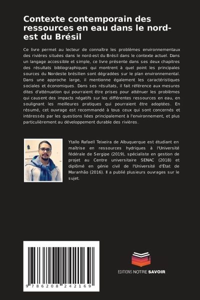 Ce livre permet au lecteur de connaître les problèmes environnementaux des rivières situées dans le nord-est du Brésil dans le contexte actuel. Dans un langage accessible et simple, ce livre présente dans ses deux chapitres des résultats bibliographiques qui montrent à quel point les principales sources du Nordeste brésilien sont dégradées sur le plan environnemental. Dans une approche large, il mentionne également les caractéristiques sociales et économiques. Dans ses résultats, il fait référence aux mesures dites d'atténuation qui pourraient être prises pour atténuer les problèmes qui causent des impacts négatifs sur les différentes ressources en eau, en soulignant les meilleures pratiques qui pourraient être adoptées. En résumé, cet ouvrage est recommandé à tous ceux qui sont concernés et intéressés par les questions liées principalement à l'environnement, et plus particulièrement au développement durable des rivières.