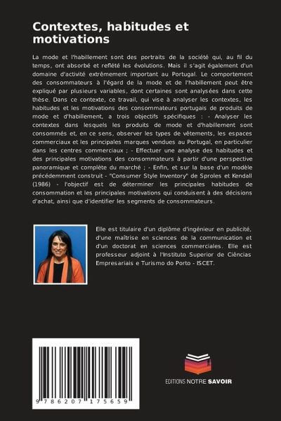 La mode et l'habillement sont des portraits de la société qui, au fil du temps, ont absorbé et reflété les évolutions. Mais il s'agit également d'un domaine d'activité extrêmement important au Portugal. Le comportement des consommateurs à l'égard de la mode et de l'habillement peut être expliqué par plusieurs variables, dont certaines sont analysées dans cette thèse. Dans ce contexte, ce travail, qui vise à analyser les contextes, les habitudes et les motivations des consommateurs portugais de produits de mode et d'habillement, a trois objectifs spécifiques : - Analyser les contextes dans lesquels les produits de mode et d'habillement sont consommés et, en ce sens, observer les types de vêtements, les espaces commerciaux et les principales marques vendues au Portugal, en particulier dans les centres commerciaux ; - Effectuer une analyse des habitudes et des principales motivations des consommateurs à partir d'une perspective panoramique et complète du marché ; - Enfin, et sur la base d'un modèle précédemment construit - "Consumer Style Inventory" de Sproles et Kendall (1986) - l'objectif est de déterminer les principales habitudes de consommation et les principales motivations qui conduisent à des décisions d'achat, ainsi que d'identifier les segments de consommateurs.