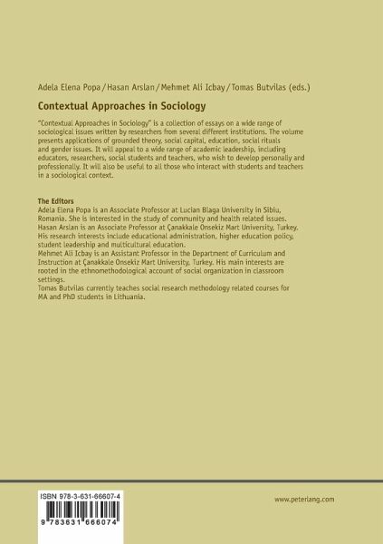 Contextual Approaches in Sociology is a collection of essays on a wide range of sociological issues written by researchers from several different institutions. The volume presents applications of grounded theory, social capital, education, social rituals and gender issues. It will appeal to a wide range of academic leadership, including educators, researchers, social students and teachers, who wish to develop personally and professionally. It will also be useful to all those who interact with students and teachers in a sociological context.