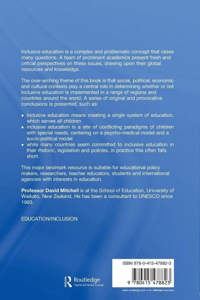 Inclusive education is a complex and problematic concept that raises many questions. A team of prominent academics present fresh and critical perspectives on these issues, drawing upon their global resources and knowledge. The over-arching theme of this book is that social, political, economic and cultural contexts play a central role in determining whether or not inclusive education is implemented in a range of regions and countries around the world. A series of original and provocative conclusions is presented, such as: inclusive education means creating a single system of education, which serves all children inclusive education is a site of conflicting paradigms of children with special needs, centering on a psycho-medical model and a socio-political model while many countries seem committed to inclusive education in their rhetoric, legislation and policies, in practice this often falls short. This major landmark resource is suitable for educational policy makers, researchers, teacher educators, students and international agencies with interests in education.