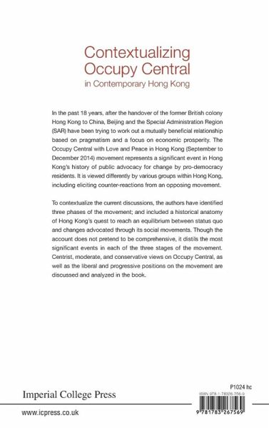 In the past 18 years, after the handover of the former British colony Hong Kong to China, Beijing and the Special Administration Region (SAR) have been trying to work out a mutually beneficial relationship based on pragmatism and a focus on economic prosperity. The Occupy Central with Love and Peace in Hong Kong (September to December 2014) movement represents a significant event in Hong Kong's history of public advocacy for change by pro-democracy residents. It is viewed differently by various groups within Hong Kong, including eliciting counter-reactions from an opposing movement. To contextualize the current discussions, the authors have identified three phases of the movement; and included a historical anatomy of Hong Kong's quest to reach an equilibrium between status quo and changes advocated through its social movements. Though the account does not pretend to be comprehensive, it distils the most significant events in each of the three stages of the movement. Centrist, moderate, and conservative views on Occupy Central, as well as the liberal and progressive positions on the movement are discussed and analyzed in the book.