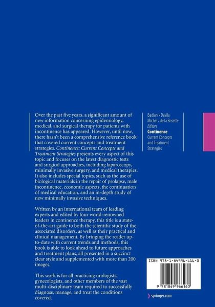 This book covers the complete field of uncomplicated incontinence ranging from the current concepts, surgical management to medical management, with a special focus on the latest diagnostic tests, surgery including laparoscopy and medical therapies. Moreover, special topics are included such as prolapse, male incontinence, economic aspects, and costs and education.