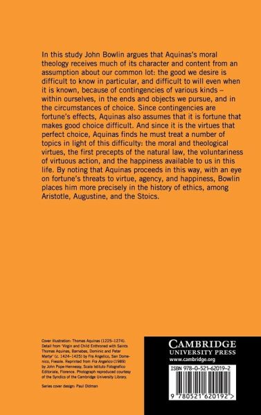 In this study John Bowlin argues that Aquinas's moral theology receives much of its character and content from an assumption about our common lot: the good we desire is difficult to know and to will, in particular because of contingencies of various kinds - within ourselves, in the ends and objects we pursue, and in the circumstances of choice. Since contingencies are fortune's effects, Aquinas insists that it is fortune that makes good choice difficult. Bowlin then explicates Aquinas's treatment of a number of topics in light of this difficulty: the moral and theological virtues, the first precepts of the natural law, the voluntariness of virtuous action, and the happiness available to us in this life. By noting that Aquinas proceeds with an eye on fortune's threats to virtue, agency, and happiness, Bowlin places him more precisely in the history of ethics, among Aristotle, Augustine, and the Stoics.