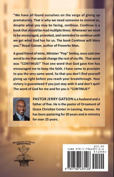 "We have all found ourselves on the verge of giving up prematurely. That is why we need someone to remind us, despite what you may be facing, continue. Continue is a book that should be read multiple times. Whenever we need to be encouraged, provoked, and reminded to continue until we get what God has for us. The book Continue will bless you." Royal A good friend of mine, Minister "Pop" Smiley, once said one word to me that would change the rest of my life. That word was "CONTINUE!" That one word that God gave him has encouraged me to keep the faith. I have come to proclaim to you the very same word. So that you don't find yourself giving up right before you reach your breakthrough. Your victory is guaranteed if you just stay with it and don't quit! The word of God for me and for you is "CONTINUE!"