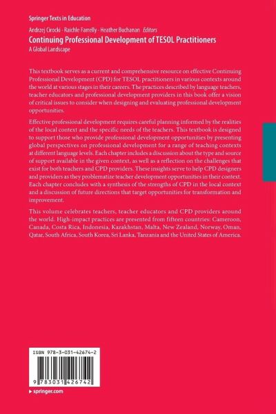 SECTION 1: An Introduction to Continuing Professional Development in TESOL.- 1. Continuing Professional Development in TESOL: Current Perspectives.- SECTION 2: Continuing Professional Development Promoting Principled Teacher Learning.- 2. Disrupting the Theory-Practice Divide: Enhancing the Professional Development of EFL Teachers in Chile.- 3. Continuous Professional Development on Qatar University's Foundation Programme.- 4. Understanding Continuing Development for TESOL Teachers in South African Secondary Schools.- SECTION 3: Continuing Professional Development for Teachers of Adult Migrant and Refugee-Background Learners.- 5. Continuing Professional Development for TESOL Instructors in Canadian Settlement Language Training Programmes in Alberta.- 6. Designing Continuing Professional Development: Currency and Effectiveness of CPD for Migrant Language Educators in the UK.- 7. Professionalizing English Instruction for Adult Immigrants and Refugees in the United States: One State's Work in Teacher.- SECTION 4: Continuing Professional Development Promoting Teacher-Led Reflective Inquiry.- 8. Learning to Teach: The Continuing Professional Development Realities of English Language Teachers in Cameroon.- 9. Continuing Professional Development for English Lecturers in Indonesia.- 10. Continuing Professional Development of TESOL Teachers in New Zealand.- 11. Continuing Professional Development for English Teachers in Oman.- 12. Intensive In-service Teacher Training: An Example from South Korea.- SECTION 5: Continuing Professional Development Directed at Emerging Trends in ELT.- 13.Foreign Language Teaching in the Digital Age: Reverse-Mentoring in the Context of a Collaborative Continuing Professional Development Programme for Secondary School TESOL Teachers.- 14. Professional Development of CLIL Teachers in a Kazakhstani Upper-Secondary School: Practices and Challenges.- 15.Dominant Language Constellation in EAL Teachers' Professional Development: Transforming Reflections into Practices in Multilingual Settings.- 16. Building a Robust Teacher Training with the Panama Bilingue Programme.- SECTION 6: Continuing Professional Development Evaluations to Promote Aspirational Models.- 17. The Implementation of a Continuing Professional Development Policy in the ELT Sector in Malta.- 18. Continuity in Outreach Teacher Development in Pakistan.- 19. Continuing Professional Development Provision in Sri Lanka: Past, Present and Future.- 20. English Language Teacher Training Practices in Tanzania.- 21. EFL Teachers' Professional Learning in Vietnam: Policy, Practice and Innovations.- SECTION 7: Concluding Remarks on Continuing Professional Development in TESOL.- 22. Continuing Professional Development in TESOL: Global Trends and New Ways Forward.