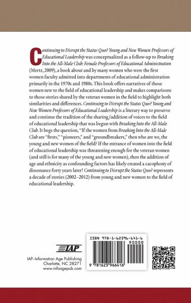 Continuing to Disrupt the Status Quo? Young and New Women Professors of Educational Leadership was conceptualized as a follow-up to Breaking Into the All- Male Club: Female Professors of Educational Administration (Mertz, 2009), a book about and by many women who were the first women faculty admitted into departments of educational administration primarily in the 1970's and 1980's. This book offers narratives of those women new to the field of educational leadership and makes comparisons to those stories shared by the veteran women in the field to highlight both similarities and differences. Continuing to Disrupt the Status Quo? Young and New Women Professors of Educational Leadership is a literary way to preserve and continue the tradition of the sharing/addition of voices to the field of educational leadership that was begun with Breaking Into the All-Male Club. It begs the question, "If the women from Breaking Into the All-Male Club are "firsts," "pioneers," and "groundbreakers," then who are we, the young and new women of the field? If the entrance of women into the field of educational leadership was threatening enough for the veteran women (and still is for many of the young and new women), then the addition of age and ethnicity as confounding factors has likely created a cacophony of dissonance forty years later! Continuing to Disrupt the Status Quo? represents a decade of stories (2002-2012) from young and new women to the field of educational leadership.