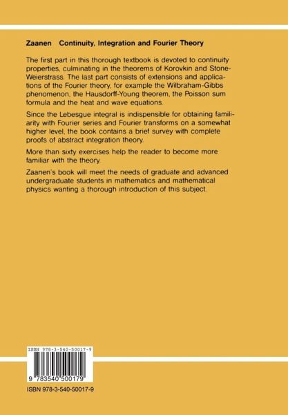 This book is a textbook for graduate or advanced undergraduate students in mathematics and (or) mathematical physics. It is not primarily aimed, therefore, at specialists (or those who wish to become specialists) in integra tion theory, Fourier theory and harmonic analysis, although even for these there might be some points of interest in the book (such as for example the simple remarks in Section 15). At many universities the students do not yet get acquainted with Lebesgue integration in their first and second year (or sometimes only with the first principles of integration on the real line ). The Lebesgue integral, however, is indispensable for obtaining a familiarity with Fourier series and Fourier transforms on a higher level; more so than by us ing only the Riemann integral. Therefore, we have included a discussion of integration theory - brief but with complete proofs - for Lebesgue measure in Euclidean space as well as for abstract measures. We give some emphasis to subjectsof which an understanding is necessary for the Fourier theory in the later chapters. In view of the emphasis in modern mathematics curric ula on abstract subjects (algebraic geometry, algebraic topology, algebraic number theory) on the one hand and computer science on the other, it may be useful to have a textbook available (not too elementary and not too spe cialized) on the subjects - classical but still important to-day - which are mentioned in the title of this book.