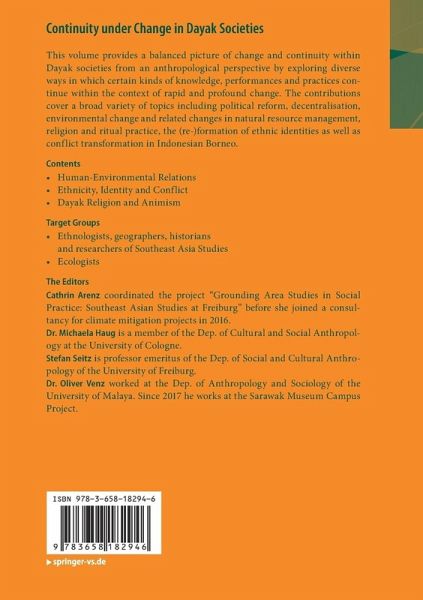 This volume provides a balanced picture of change and continuity within Dayak societies from an anthropological perspective by exploring diverse ways in which certain kinds of knowledge, performances and practices continue within the context of rapid and profound change. The contributions cover a broad variety of topics including political reform, decentralisation, environmental change and related changes in natural resource management, religion and ritual practice, the (re-)formation of ethnic identities as well as conflict transformation in Indonesian Borneo.