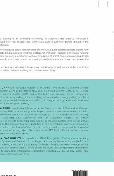 Continuous Auditing provides academics and practitioners with a compilation of select continuous auditing design science research, and it provides readers with an understanding of the underlying theoretical concepts of a continuous audit, ideas on how continuous audit can be applied in practice, and what has and has not worked in research.