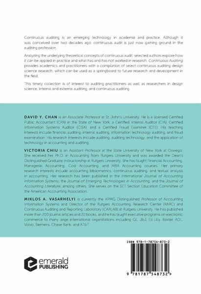 Continuous Auditing provides academics and practitioners with a compilation of select continuous auditing design science research, and it provides readers with an understanding of the underlying theoretical concepts of a continuous audit, ideas on how continuous audit can be applied in practice, and what has and has not worked in research.