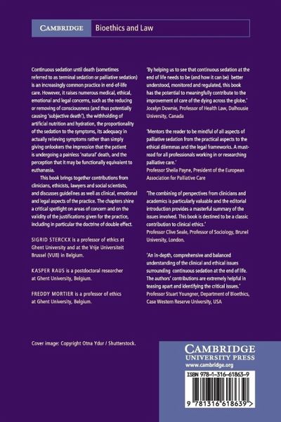 Continuous sedation until death (sometimes referred to as terminal sedation or palliative sedation) is an increasingly common practice in end-of-life care. However, it raises numerous medical, ethical, emotional and legal concerns, such as the reducing or removing of consciousness (and thus potentially causing 'subjective death'), the withholding of artificial nutrition and hydration, the proportionality of the sedation to the symptoms, its adequacy in actually relieving symptoms rather than simply giving onlookers the impression that the patient is undergoing a painless 'natural' death, and the perception that it may be functionally equivalent to euthanasia. This book brings together contributions from clinicians, ethicists, lawyers and social scientists, and discusses guidelines as well as clinical, emotional and legal aspects of the practice. The chapters shine a critical spotlight on areas of concern and on the validity of the justifications given for the practice, including in particular the doctrine of double effect.