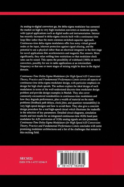 Continuous-Time Delta-Sigma Modulators for High-Speed A/D Conversion: Theory, Practice and Fundamental Performance Limits covers all aspects of continuous-time delta-sigma modulator design, with particular emphasis on design for high clock speeds. The authors explain the ideal design of such modulators in terms of the well-understood discrete-time modulator design problem and provide design examples in Matlab. They also cover commonly-encountered non-idealities in continuous-time modulators and how they degrade performance, plus a wealth of material on the main problems (feedback path delays, clock jitter, and quantizer metastability) in very high-speed designs and how to avoid them. They also give a concrete design procedure for a real high-speed circuit which illustrates the tradeoffs in the selection of key parameters. Detailed circuit diagrams, simulation results and test results for an integrated continuous-time 4 GHz band-pass modulator for A/D conversion of 1 GHz analog signals are also presented.