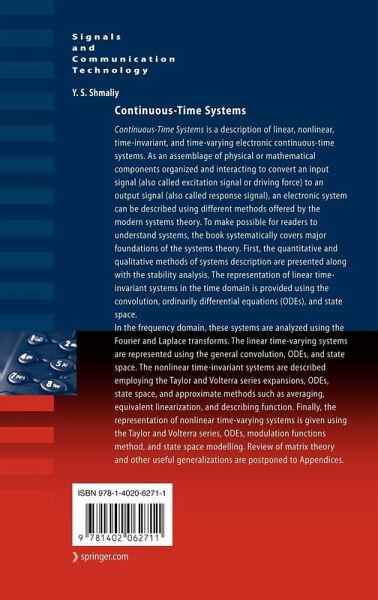 Continuous-Time Systems is a description of linear, nonlinear, time-invariant, and time-varying electronic continuous-time systems. As an assemblage of physical or mathematical components organized and interacting to convert an input signal (also called excitation signal or driving force) to an output signal (also called response signal), an electronic system can be described using different methods offered by the modern systems theory. To make possible for readers to understand systems, the book systematically covers major foundations of the systems theory. First, the quantitative and qualitative methods of systems description are presented along with the stability analysis. The representation of linear time-invariant systems in the time domain is provided using the convolution, ordinarily differential equations (ODEs), and state space. In the frequency domain, these systems are analyzed using the Fourier and Laplace transforms. The linear time-varying systems are represented using the general convolution, ODEs, and state space. The nonlinear time-invariant systems are described employing the Taylor and Volterra series expansions, ODEs, state space, and approximate methods such as averaging, equivalent linearization, and describing function. Finally, the representation of nonlinear time-varying systems is given using the Taylor and Volterra series, ODEs, modulation functions method, and state space modelling. Review of matrix theory and other useful generalizations are postponed to Appendices.
