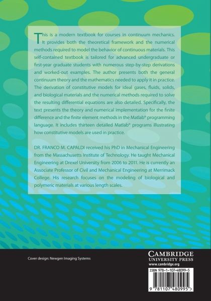 This is a modern textbook for courses in continuum mechanics. It provides both the theoretical framework and the numerical methods required to model the behaviour of continuous materials. This self-contained textbook is tailored for advanced undergraduate or first-year graduate students with numerous step-by-step derivations and worked-out examples. The author presents both the general continuum theory and the mathematics needed to apply it in practice. The derivation of constitutive models for ideal gases, fluids, solids and biological materials, and the numerical methods required to solve the resulting differential equations, are also detailed. Specifically, the text presents the theory and numerical implementation for the finite difference and the finite element methods in the Matlab® programming language. It includes thirteen detailed Matlab® programs illustrating how constitutive models are used in practice.