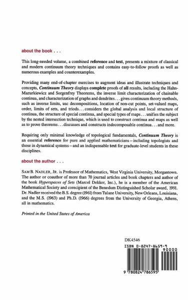 ". . .an important addition to the topology literature. . ..a tremendous help for anyone who wishes to learn continuum theory. . .. . . .a long-awaited textbook enabling fundamental concepts and techniques used in continuum theory to be learned in a systematic manner. . ..an indispensable text and reference book in continuum theory. "