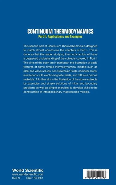 Zentralblatt MATH This second part of Continuum Thermodynamics is designed to match almost one-to-one the chapters of Part I. This is done so that the reader studying thermodynamics will have a deepened understanding of the subjects covered in Part I. The aims of the book are in particular: the illustration of basic features of some simple thermodynamical models such as ideal and viscous fluids, non-Newtonian fluids, nonlinear solids, interactions with electromagnetic fields, and diffusive porous materials. A further aim is the illustration of the above subjects by examples and simple solutions of initial and boundary problems as well as simple exercises to develop skills in the construction of interdisciplinary macroscopic models.