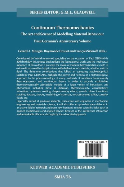 Contributed by world-renowned specialists on the occasion of Paul Germain's 80th birthday, this unique book reflects the foundational works and the intellectual influence of this author. It presents the realm of modern thermomechanics with its extraordinary wealth of applications to the behaviour of materials, whether solid or fluid. The thirty-one contributions follow an easygoing autobiographical sketch by Paul Germain, and highlight the power and richness of a methodological approach to the phenomenology of many materials. This approach combines harmoniously thermodynamics and continuum theory in order to provide exploitable, thermodynamically admissible models of a large variety of behaviours and phenomena, including those of diffusion, thermoelasticity, viscoplasticity, relaxation, hysteresis, wetting, shape-memory effects, growth, phase transitions, stability, fracture, shocks, machining of materials, microstructured solids, complex fluids, etc.