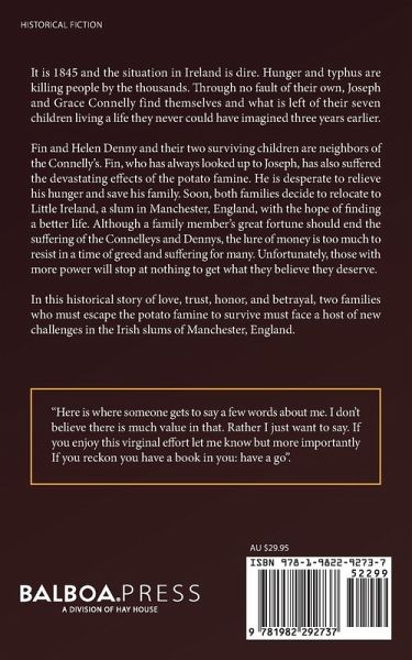 It is 1845 and the situation in Ireland is dire. Hunger and typhus are killing people by the thousands. Through no fault of their own, Joseph and Grace Connelly find themselves and what is left of their seven children living a life they never could have imagined three years earlier. Fin and Helen Denny and their two surviving children are neighbors of the Connelly's. Fin, who has always looked up to Joseph, has also suffered the devastating effects of the potato famine. He is desperate to relieve his hunger and save his family. Soon, both families decide to relocate to Little Ireland, a slum in Manchester, England, with the hope of finding a better life. Although a family member's great fortune should end the suffering of the Connelleys and Dennys, the lure of money is too much to resist in a time of greed and suffering for many. Unfortunately, those with more power will stop at nothing to get what they believe they deserve. In this historical story of love, trust, honor, and betrayal, two families who must escape the potato famine to survive must face a host of new challenges in the Irish slums of Manchester, England.