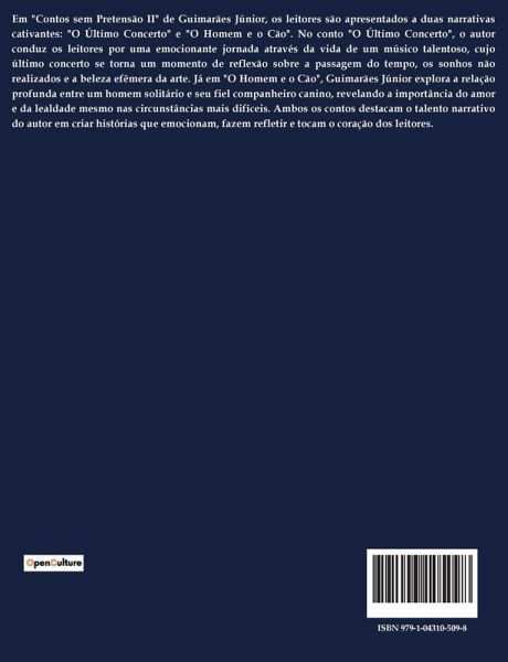 Em "Contos sem Pretensão II" de Guimarães Júnior, os leitores são apresentados a duas narrativas cativantes: "O Último Concerto" e "O Homem e o Cão". No conto "O Último Concerto", o autor conduz os leitores por uma emocionante jornada através da vida de um músico talentoso, cujo último concerto se torna um momento de reflexão sobre a passagem do tempo, os sonhos não realizados e a beleza efêmera da arte. Já em "O Homem e o Cão", Guimarães Júnior explora a relação profunda entre um homem solitário e seu fiel companheiro canino, revelando a importância do amor e da lealdade mesmo nas circunstâncias mais difíceis. Ambos os contos destacam o talento narrativo do autor em criar histórias que emocionam, fazem refletir e tocam o coração dos leitores.