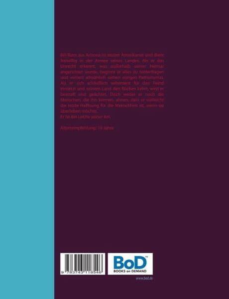 Bill Rizer aus Arizona ist stolzer Amerikaner und dient freiwillig in der Armee seines Landes. Als er das Unrecht erkennt, was außerhalb seiner Heimat angerichtet wurde, beginnt er alles zu hinterfragen und verliert allmählich seinen vorigen Patriotismus. Als er sich schließlich vehement für den Feind einsetzt und seinem Land den Rücken kehrt, wird er bestraft und geächtet. Doch weder er noch die Menschen, die ihn kennen, ahnen, dass er vielleicht die letzte Hoffnung für die Menschheit ist, wenn sie überleben möchte.Er ist der Letzte seiner Art.Altersempfehlung: 18 Jahre