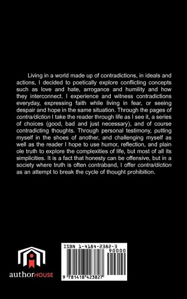 Living in a world made up of contradictions, in ideals and actions, I decided to poetically explore conflicting concepts such as love and hate, arrogance and humility and how they interconnect. I experience and witness contradictions everyday, expressing faith while living in fear, or seeing despair and hope in the same situation. Through the pages of contra / diction I take the reader through life as I see it, a series of choices (good, bad and just necessary), and of course contradicting thoughts. Through personal testimony, putting myself in the shoes of another, and challenging myself as well as the reader I hope to use humor, reflection, and plain ole truth to explore the complexities of life, but most of all its simplicities. It is a fact that honesty can be offensive, but in a society where truth is often contraband, I offer contra / diction as an attempt to break the cycle of thought prohibition.