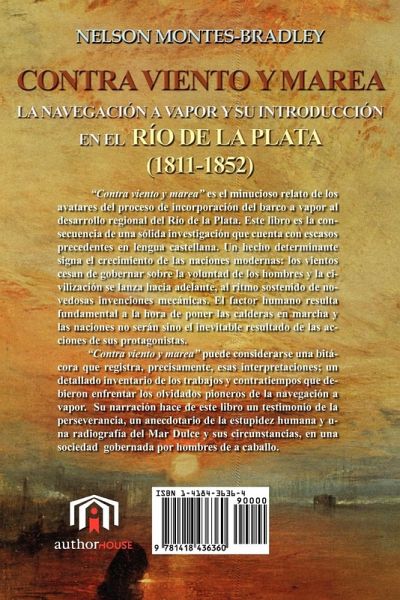 Sobre la obra "Contra viento y marea" es el minucioso relato de los avata-res que acompañaron la incorporación del barco a vapor al desarrollo regional del Río de la Plata. El libro es la consecuencia de una sólida investigación que cuenta con escasos precedentes, en lengua castella-na. Un hecho determinante signa el crecimiento de las naciones mo-dernas. Los vientos cesan de gobernar sobre las voluntades del hom-bre y la humanidad se lanza a ritmo sostenido de novedosas invencio-nes mecánicas. El factor humano resulta fundamental a la hora de po-ner las calderas en funcionamiento, y las naciones no serán sino el inevitable resultado de las acciones de sus protagonistas. "Contra viento y marea" puede considerarse una bitácora que registra, precisamente, esas interpretaciones; un detallado inventario de los trabajos y contratiempos que debieron enfrentar los olvidados pioneros de la navegación a vapor. Su narración hace de este libro un testimonio de la perseverancia, un anecdotario de la estupidez humana y una radiografía del Mar Dulce y sus circunstancias, en un mundo gobernado por hombres de a caballo.