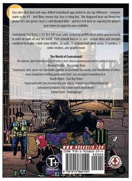 Ever since that dark web virus shifted Contraband app control to any top Influencer - everyone wants to be #1! And Blues newest star Jose is rising fast. But disgraced beat cop Benny has photos he's sure proves Jose's a cold-blooded killer - and he's hell-bent on exposing the player's past crimes to regain his own credibility. Contraband: Bad Benny is the first full-issue comic created by graffiti street artists spontaneously in order on walls all over the world. Each artwork lives on its own - unique ideas and concepts combined to inspire a dark crime thriller. 26 walls, 15 underground street artists, 9 countries, 5 comic creators...one graphic novel. The World of Contraband: "An intense, dark foreshadowing of today's tech-driven paranoia and online political chaos." Deanna Destito - The Comics Beat "Cautionary tales about our insatiable appetite to download the misery and humiliation of others have turned into a telling genre unto itself...has an urgent immediacy to it." Randy Myers - East Bay Times "Impressed with how prescient the core idea is; reminds me of Black Mirror but Contraband predates it by 3 years and is much better." Kelvin Green - Brainsplurge!