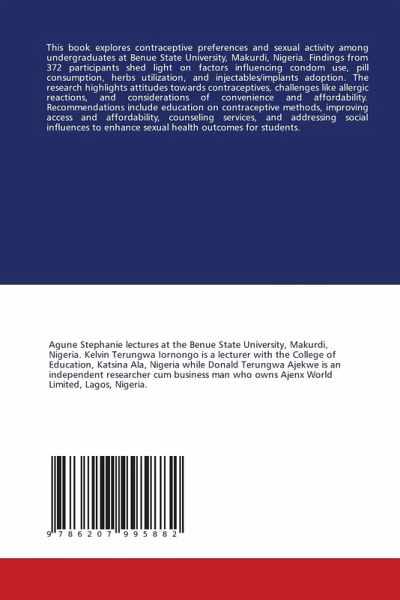 This book explores contraceptive preferences and sexual activity among undergraduates at Benue State University, Makurdi, Nigeria. Findings from 372 participants shed light on factors influencing condom use, pill consumption, herbs utilization, and injectables/implants adoption. The research highlights attitudes towards contraceptives, challenges like allergic reactions, and considerations of convenience and affordability. Recommendations include education on contraceptive methods, improving access and affordability, counseling services, and addressing social influences to enhance sexual health outcomes for students.
