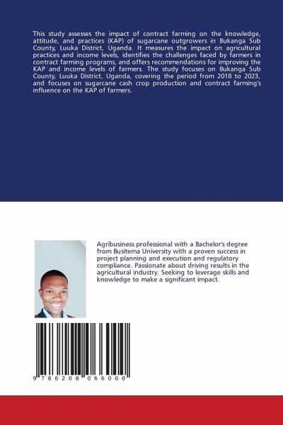 This study assesses the impact of contract farming on the knowledge, attitude, and practices (KAP) of sugarcane outgrowers in Bukanga Sub County, Luuka District, Uganda. It measures the impact on agricultural practices and income levels, identifies the challenges faced by farmers in contract farming programs, and offers recommendations for improving the KAP and income levels of farmers. The study focuses on Bukanga Sub County, Luuka District, Uganda, covering the period from 2018 to 2023, and focuses on sugarcane cash crop production and contract farming's influence on the KAP of farmers.