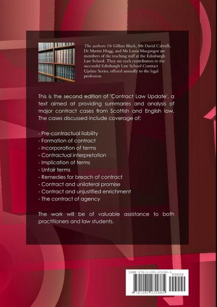 This is the second edition of 'Contract Law Update', a text aimed at providing summaries and analysis of major contract cases from Scottish and English law. The cases discussed include coverage of: - Pre-contractual liability - Formation of contract - Incorporation of terms - Contractual interpretation - Implication of terms - Unfair terms - Remedies for breach of contract - Contract and unilateral promise - Contract and unjustified enrichment - The contract of agency The work will be of valuable assistance to both practitioners and law students.