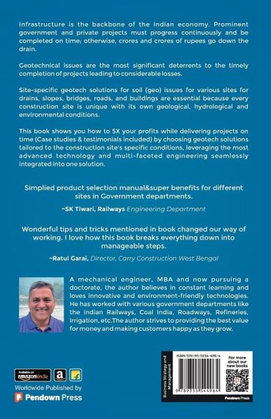 Infrastructure is the backbone of the Indian economy. Prominent government and private projects must progress continuously and be completed on time; otherwise, crores and crores of rupees go down the drain. Geotechnical issues are the most significant deterrents to the timely completion of projects leading to considerable losses. Site-specific geotech solutions for soil (geo) issues for various sites for drains, slopes, bridges, roads, and buildings are essential because every construction site is unique with its own geological, hydrological and environmental conditions. This book shows you how to 5X your profits while delivering projects on time (Case studies & testimonials included) by choosing geotech solutions tailored to the construction site's specific conditions, leveraging the most advanced technology and multi-faceted engineering seamlessly integrated into one solution. A mechanical engineer, MBA and now pursuing a doctorate, the author believes in constant learning and loves innovative and environment-friendly technologies. He has worked with various government departments like the Indian Railways, Coal India, Roadways, Refineries, Irrigation, etc.The author strives to providing the best value for money and making customers happy as they grow.