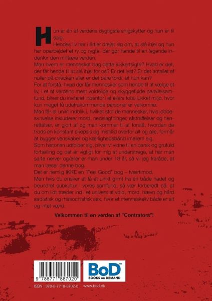 Hun er én af verdens dygtigste snigskytter og hun er til salg. Hendes liv har i årtier drejet sig om, at slå ihjel og hun har oparbejdet et ry og rygte, der gør hende til en legende indenfor den militære verden. Men hvem er mennesket bag dette kikkertsigte? Hvad er det, der får hende til at slå ihjel for os? Er det lyst? Er det antallet af nuller på checken eller er det bare fordi, at hun kan? For at forstå, hvad der får mennesker som hende til at vælge et liv, i et af verdens mest voldelige og skyggefulde parallelsamfund, bliver du inviteret indenfor i et ellers total lukket miljø, hvor kun meget få udefrakommende personer er velkomne. Man får et unikt indblik i, hvilket stof de mennesker, hvis jobbeskrivelse inkluderer mord, nedslagtninger, afstraffelser og henrettelser, er gjort af og man kommer til at forstå, hvordan de trods en konstant skepsis og mistillid overfor alt og alle, formår at bygger venskaber og kærlighedsbånd imellem sig. Som historien udfolder sig, bliver vi vidne til en barsk og grufuld fortælling og det er vigtigt for mig at understrege, at har man sarte nerver og/eller er man under 18 år, så vil jeg fraråde, at man læser denne bog. Det er nemlig IKKE en "Feel Good" bog ¿ tværtimod. Men hvis du ønsker at få et unikt glimt fra én både hadet og beundret subkultur i vores samfund, så vær forberedt på, at du om lidt træder ind i et univers af vold, mord, hævn og hård sadistisk og masochistisk sex, hvor et menneskeliv både er alt og intet værd. Velkommen til en verden af "Contrators"!