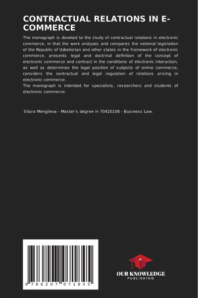 The monograph is devoted to the study of contractual relations in electronic commerce, in that the work analyzes and compares the national legislation of the Republic of Uzbekistan and other states in the framework of electronic commerce, presents legal and doctrinal definition of the concept of electronic commerce and contract in the conditions of electronic interaction, as well as determines the legal position of subjects of online commerce, considers the contractual and legal regulation of relations arising in electronic commerce. The monograph is intended for specialists, researchers and students of electronic commerce.