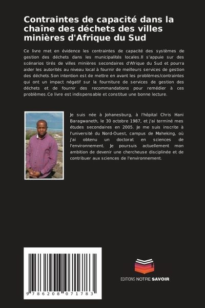 Ce livre met en évidence les contraintes de capacité des systèmes de gestion des déchets dans les municipalités locales.Il s'appuie sur des scénarios tirés de villes minières secondaires d'Afrique du Sud et pourra aider les autorités au niveau local à fournir de meilleurs services de gestion des déchets.Son intention est de mettre en avant les problèmes/contraintes qui ont un impact négatif sur la fourniture de services de gestion des déchets et de fournir des recommandations pour remédier à ces problèmes.Ce livre est indispensable et constitue une bonne lecture.