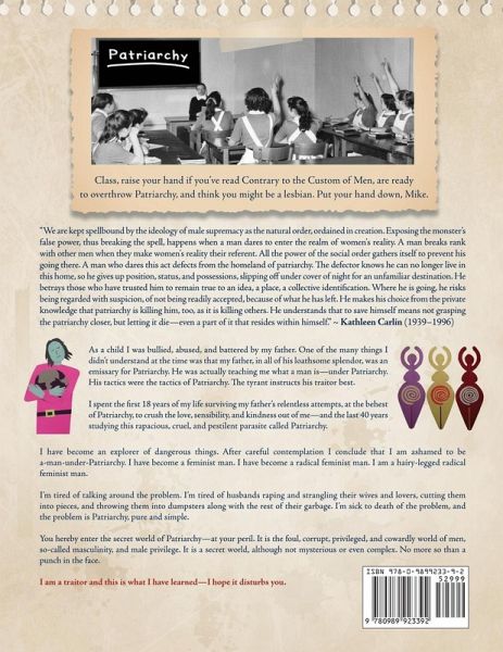 As a child I was bullied, abused, and battered by my father. One of the many things I didn't understand at the time was that my father, in all of his loathsome splendor, was an emissary for Patriarchy. He was actually teaching me what a man is-under Patriarchy. His tactics were the tactics of Patriarchy. The tyrant instructs his traitor best. I spent the first 18 years of my life surviving my father's relentless attempts, at the behest of Patriarchy, to crush the love, sensibility, and kindness out of me-and the last 40 years studying this rapacious, cruel, and pestilent parasite called Patriarchy. I have become an explorer of dangerous things. After careful contemplation I conclude that I am ashamed to be a-man-under-Patriarchy. I have become a feminist man. I have become a radical feminist man. I am a hairy-legged radical feminist man. I'm tired of talking around the problem. I'm tired of husbands raping and strangling their wives and lovers, cutting them into pieces, and throwing them into dumpsters along with the rest of their garbage. I'm sick to death of the problem, and the problem is Patriarchy, pure and simple. You hereby enter the secret world of Patriarchy-at your peril. It is the foul, corrupt, privileged, and cowardly world of men, so-called masculinity, and male privilege. It is a secret world, although not mysterious or even complex. No more so than a punch in the face. I am a traitor and this is what I have learned-I hope it disturbs you.