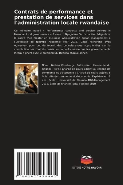 Ce mémoire intitulé « Performamce contracts and service delivery in Rwandan local governments » A case of Nyagatare District a été rédigé dans le cadre d'un master en Business Administration option management à l'Université de Nkumba Academic year 2013. Cette recherche avait également pour but de fournir des connaissances approfondies sur la contribution des contrats basés sur la performance que les gouvernements locaux signent avec le président du Rwanda chaque année.