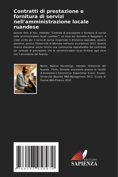 Questo libro di tesi, intitolato ¿Contratti di prestazione e fornitura di servizi nelle amministrazioni locali ruandesi¿, un caso del distretto di Nyagatare, è stato scritto per il corso di laurea magistrale in Economia aziendale, opzione gestione, presso l'Università di Nkumba nell'anno accademico 2013. Questa ricerca intendeva anche fornire una conoscenza approfondita del contributo dei contratti di prestazione che le amministrazioni locali firmano ogni anno con il presidente del Ruanda.