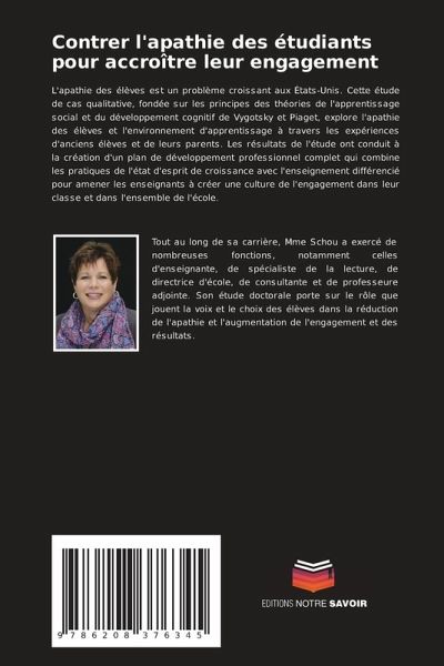 L'apathie des élèves est un problème croissant aux États-Unis. Cette étude de cas qualitative, fondée sur les principes des théories de l'apprentissage social et du développement cognitif de Vygotsky et Piaget, explore l'apathie des élèves et l'environnement d'apprentissage à travers les expériences d'anciens élèves et de leurs parents. Les résultats de l'étude ont conduit à la création d'un plan de développement professionnel complet qui combine les pratiques de l'état d'esprit de croissance avec l'enseignement différencié pour amener les enseignants à créer une culture de l'engagement dans leur classe et dans l'ensemble de l'école.