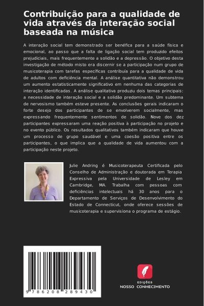 A interação social tem demonstrado ser benéfica para a saúde física e emocional, ao passo que a falta de ligação social tem produzido efeitos prejudiciais, mais frequentemente a solidão e a depressão. O objetivo desta investigação de método misto era discernir se a participação num grupo de musicoterapia com tarefas específicas contribuía para a qualidade de vida de adultos com deficiência mental. A análise quantitativa não demonstrou um aumento estatisticamente significativo em nenhuma das categorias de interação identificadas. A análise qualitativa produziu dois temas principais: a necessidade de interação social e a solidão predominante. Um subtema de nervosismo também esteve presente. As conclusões gerais indicaram o forte desejo dos participantes de se envolverem socialmente, mas expressando frequentemente sentimentos de solidão. Nove dos dez participantes expressaram uma reação positiva à participação no projeto e no evento público. Os resultados qualitativos também indicaram que houve um processo de grupo saudável e uma coesão positiva entre os participantes, o que implica que a qualidade de vida aumentou com a participação neste projeto.