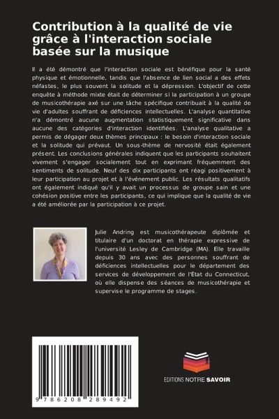 Il a été démontré que l'interaction sociale est bénéfique pour la santé physique et émotionnelle, tandis que l'absence de lien social a des effets néfastes, le plus souvent la solitude et la dépression. L'objectif de cette enquête à méthode mixte était de déterminer si la participation à un groupe de musicothérapie axé sur une tâche spécifique contribuait à la qualité de vie d'adultes souffrant de déficiences intellectuelles. L'analyse quantitative n'a démontré aucune augmentation statistiquement significative dans aucune des catégories d'interaction identifiées. L'analyse qualitative a permis de dégager deux thèmes principaux : le besoin d'interaction sociale et la solitude qui prévaut. Un sous-thème de nervosité était également présent. Les conclusions générales indiquent que les participants souhaitent vivement s'engager socialement tout en exprimant fréquemment des sentiments de solitude. Neuf des dix participants ont réagi positivement à leur participation au projet et à l'événement public. Les résultats qualitatifs ont également indiqué qu'il y avait un processus de groupe sain et une cohésion positive entre les participants, ce qui implique que la qualité de vie a été améliorée par la participation à ce projet.