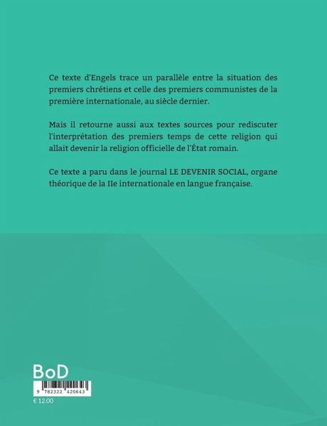 Ce texte d'Engels trace un parallèle entre la situation des premiers chrétiens et celle des premiers communistes de la première internationale, au siècle dernier.Mais il retourne aussi aux textes sources pour rediscuter l'interprétation des premiers temps de cette religion qui allait devenir la religion officielle de l'État romain.Ce texte a paru dans le journal LE DEVENIR SOCIAL, organe théorique de la IIe internationale en langue française.