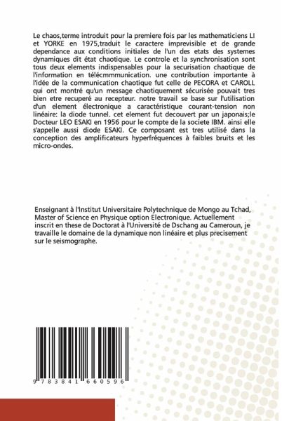 Le chaos,terme introduit pour la premiere fois par les mathematiciens LI et YORKE en 1975,traduit le caractere imprevisible et de grande dependance aux conditions initiales de l'un des etats des systemes dynamiques dit état chaotique. Le controle et la synchronisation sont tous deux elements indispensables pour la securisation chaotique de l'information en télécmmmunication. une contribution importante à l'idée de la communication chaotique fut celle de PECORA et CAROLL qui ont montré qu'un message chaotiquement sécurisée pouvait tres bien etre recuperé au recepteur. notre travail se base sur l'utilisation d'un element électronique a caractéristique courant-tension non linéaire: la diode tunnel. cet element fut decouvert par un japonais;le Docteur LEO ESAKI en 1956 pour le compte de la societe IBM. ainsi elle s'appelle aussi diode ESAKI. Ce composant est tres utilisé dans la conception des amplificateurs hyperfréquences à faibles bruits et les micro-ondes.