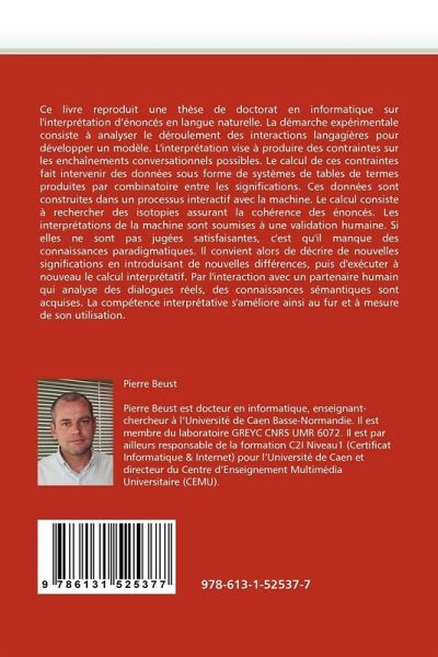 Ce livre reproduit une thèse de doctorat en informatique sur l'interprétation d'énoncés en langue naturelle. La démarche expérimentale consiste à analyser le déroulement des interactions langagières pour développer un modèle. L'interprétation vise à produire des contraintes sur les enchaînements conversationnels possibles. Le calcul de ces contraintes fait intervenir des données sous forme de systèmes de tables de termes produites par combinatoire entre les significations. Ces données sont construites dans un processus interactif avec la machine. Le calcul consiste à rechercher des isotopies assurant la cohérence des énoncés. Les interprétations de la machine sont soumises à une validation humaine. Si elles ne sont pas jugées satisfaisantes, c'est qu'il manque des connaissances paradigmatiques. Il convient alors de décrire de nouvelles significations en introduisant de nouvelles différences, puis d'exécuter à nouveau le calcul interprétatif. Par l'interaction avec un partenaire humain qui analyse des dialogues réels, des connaissances sémantiques sont acquises. La compétence interprétative s'améliore ainsi au fur et à mesure de son utilisation.
