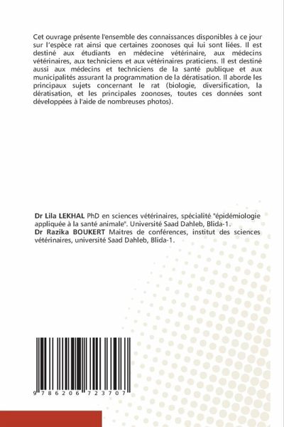 Cet ouvrage présente l'ensemble des connaissances disponibles à ce jour sur l'espèce rat ainsi que certaines zoonoses qui lui sont liées. Il est destiné aux étudiants en médecine vétérinaire, aux médecins vétérinaires, aux techniciens et aux vétérinaires praticiens. Il est destiné aussi aux médecins et techniciens de la santé publique et aux municipalités assurant la programmation de la dératisation. Il aborde les principaux sujets concernant le rat (biologie, diversification, la dératisation, et les principales zoonoses, toutes ces données sont développées à l'aide de nombreuses photos).
