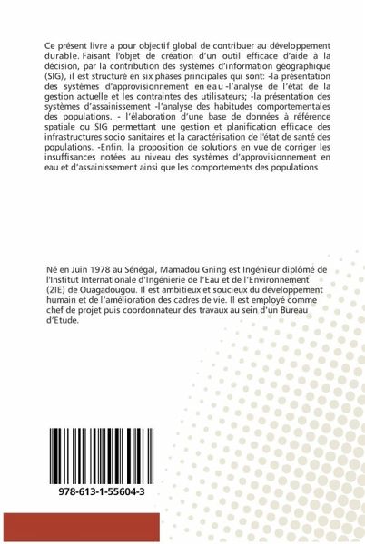 Ce présent livre a pour objectif global de contribuer au développement durable. Faisant l'objet de création d'un outil efficace d'aide à la décision, par la contribution des systèmes d'information géographique (SIG), il est structuré en six phases principales qui sont: -la présentation des systèmes d'approvisionnement en eau -l'analyse de l'état de la gestion actuelle et les contraintes des utilisateurs; -la présentation des systèmes d'assainissement -l'analyse des habitudes comportementales des populations. - l'élaboration d'une base de données à référence spatiale ou SIG permettant une gestion et planification efficace des infrastructures socio sanitaires et la caractérisation de l'état de santé des populations. -Enfin, la proposition de solutions en vue de corriger les insuffisances notées au niveau des systèmes d'approvisionnement en eau et d'assainissement ainsi que les comportements des populations