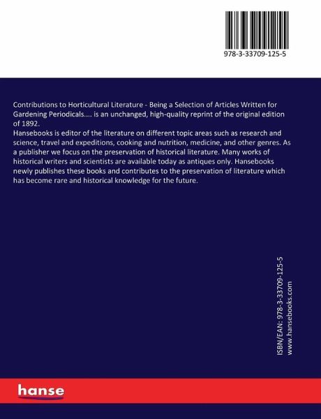 Contributions to Horticultural Literature - Being a Selection of Articles Written for Gardening Periodicals.... is an unchanged, high-quality reprint of the original edition of 1892.Hansebooks is editor of the literature on different topic areas such as research and science, travel and expeditions, cooking and nutrition, medicine, and other genres. As a publisher we focus on the preservation of historical literature. Many works of historical writers and scientists are available today as antiques only. Hansebooks newly publishes these books and contributes to the preservation of literature which has become rare and historical knowledge for the future.