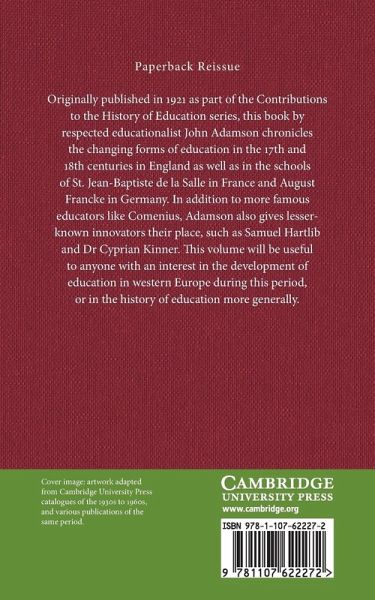 Originally published in 1921 as part of the Contributions to the History of Education series, this book by respected educationalist John Adamson chronicles the changing forms of education in the 17th and 18th centuries in England as well as in the schools of St. Jean-Baptiste de la Salle in France and August Francke in Germany. In addition to more famous educators like Comenius, Adamson also gives lesser-known innovators their place, such as Samuel Hartlib and Dr Cyprian Kinner. This volume will be useful to anyone with an interest in the development of education in western Europe during this period, or in the history of education more generally.