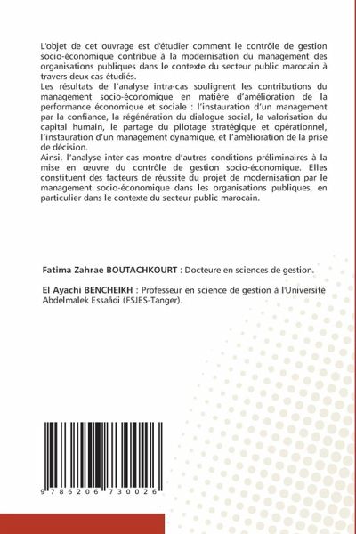 L'objet de cet ouvrage est d'étudier comment le contrôle de gestion socio-économique contribue à la modernisation du management des organisations publiques dans le contexte du secteur public marocain à travers deux cas étudiés. Les résultats de l'analyse intra-cas soulignent les contributions du management socio-économique en matière d'amélioration de la performance économique et sociale : l'instauration d'un management par la confiance, la régénération du dialogue social, la valorisation du capital humain, le partage du pilotage stratégique et opérationnel, l'instauration d'un management dynamique, et l'amélioration de la prise de décision.Ainsi, l'analyse inter-cas montre d'autres conditions préliminaires à la mise en oeuvre du contrôle de gestion socio-économique. Elles constituent des facteurs de réussite du projet de modernisation par le management socio-économique dans les organisations publiques, en particulier dans le contexte du secteur public marocain.