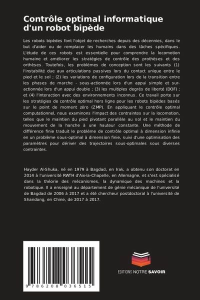 Les robots bipèdes font l'objet de recherches depuis des décennies, dans le but d'aider ou de remplacer les humains dans des tâches spécifiques. L'étude de ces robots est essentielle pour comprendre la locomotion humaine et améliorer les stratégies de contrôle des prothèses et des orthèses. Toutefois, les problèmes de conception sont les suivants (1) l'instabilité due aux articulations passives lors du contact unique entre le pied et le sol ; (2) les variations de configuration lors de la transition entre les phases de marche - sous-actionnée lors d'un appui simple et sur-actionnée lors d'un appui double ; (3) les multiples degrés de liberté (DOF) ; et (4) l'interaction avec des environnements inconnus. Ce travail porte sur les stratégies de contrôle optimal hors ligne pour les robots bipèdes basés sur le point de moment zéro (ZMP). En appliquant le contrôle optimal computationnel, nous examinons l'impact des contraintes sur la locomotion, telles que le maintien du pied pivotant parallèle au sol et le maintien du mouvement de la hanche à une hauteur constante. Une méthode de différence finie traduit le problème de contrôle optimal à dimension infinie en un problème sous-optimal à dimension finie, suivi d'une optimisation des paramètres pour dériver des trajectoires sous-optimales sous diverses contraintes.