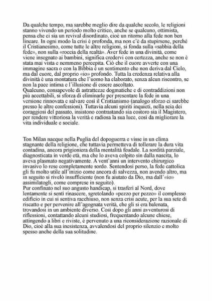 Da qualche tempo, ma sarebbe meglio dire da qualche secolo, le religioni stanno vivendo un periodo molto critico, anche se qualcuno, ottimista, pensa che ci sia un revival disordinato, cioè un ritorno alla fede non ben lineare. In ogni modo la crisi è profonda, ma non c'è da stupirsene, perché il Cristianesimo, come tutte le altre religioni, si fonda sulla sabbia della fede, non sulla roccia della realtà. Aver fede in una divinità, come viene insegnato ai bambini, significa credervi con certezza, anche se non è stata mai vista e nemmeno percepita. Ciò che il cuore avverte con una immagine sacra o con la Bibbia è un sentimento che non deriva dal Cielo, ma dal cuore, dal proprio io profondo. Tutta la credenza relativa alla divinità è una montatura che l'uomo ha elaborato, senza alcun riscontro, se non la pace intima e l'illusione di essere ascoltato. Qualcuno, consapevole di astrattezze dogmatiche e di contraddizioni non più accettabili, si sforza di eliminarle per presentare la fede in una versione rinnovata e salvare così il Cristianismo (analogo sforzo ci sarebbe presso le altre confessioni). Tuttavia alcuni spiriti inquieti, nella scia dei coraggiosi del passato, insistono contrastando sia costoro sia il Magistero, per rendere vittoriosa la verità e radiosa la sua luce, così da migliorare la vita individuale e sociale.